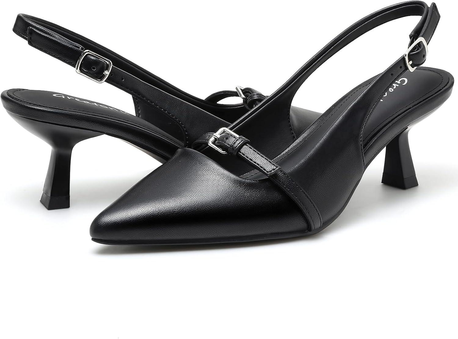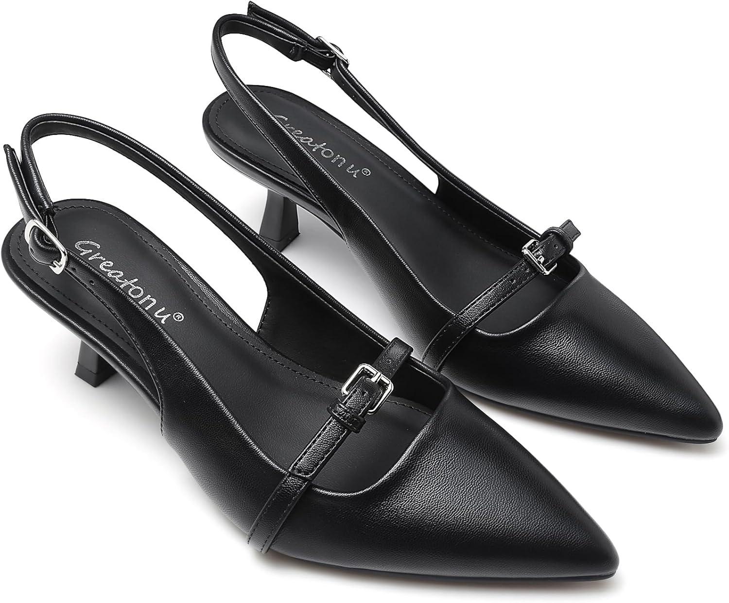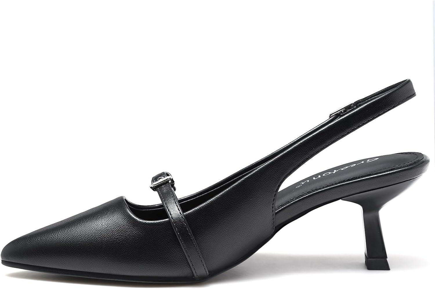 Greatonu Women’s Kitten Heels Pointed Toe Slingback Leather Insole Dress Pumps Shoes(Black-mary Jane)