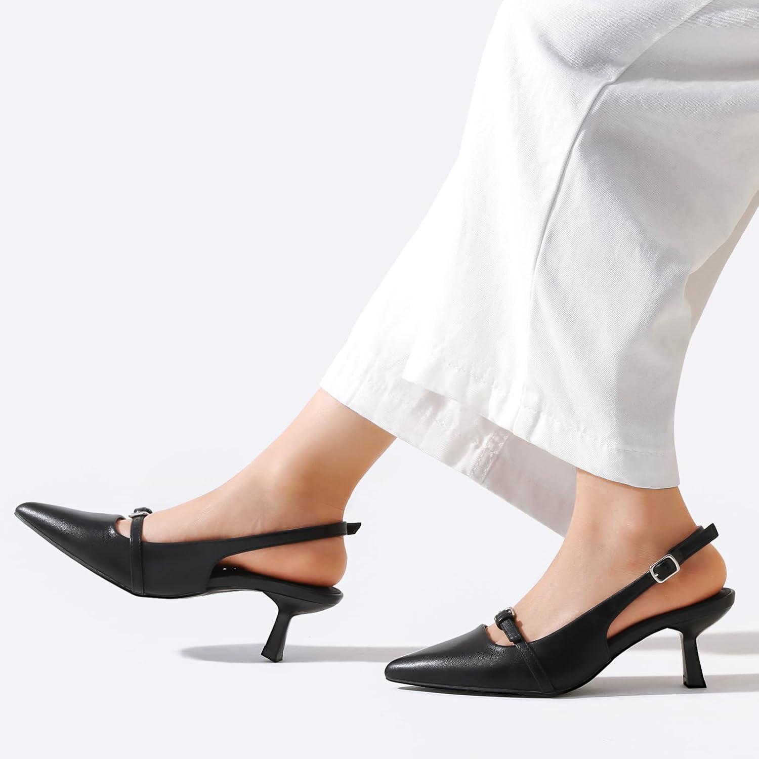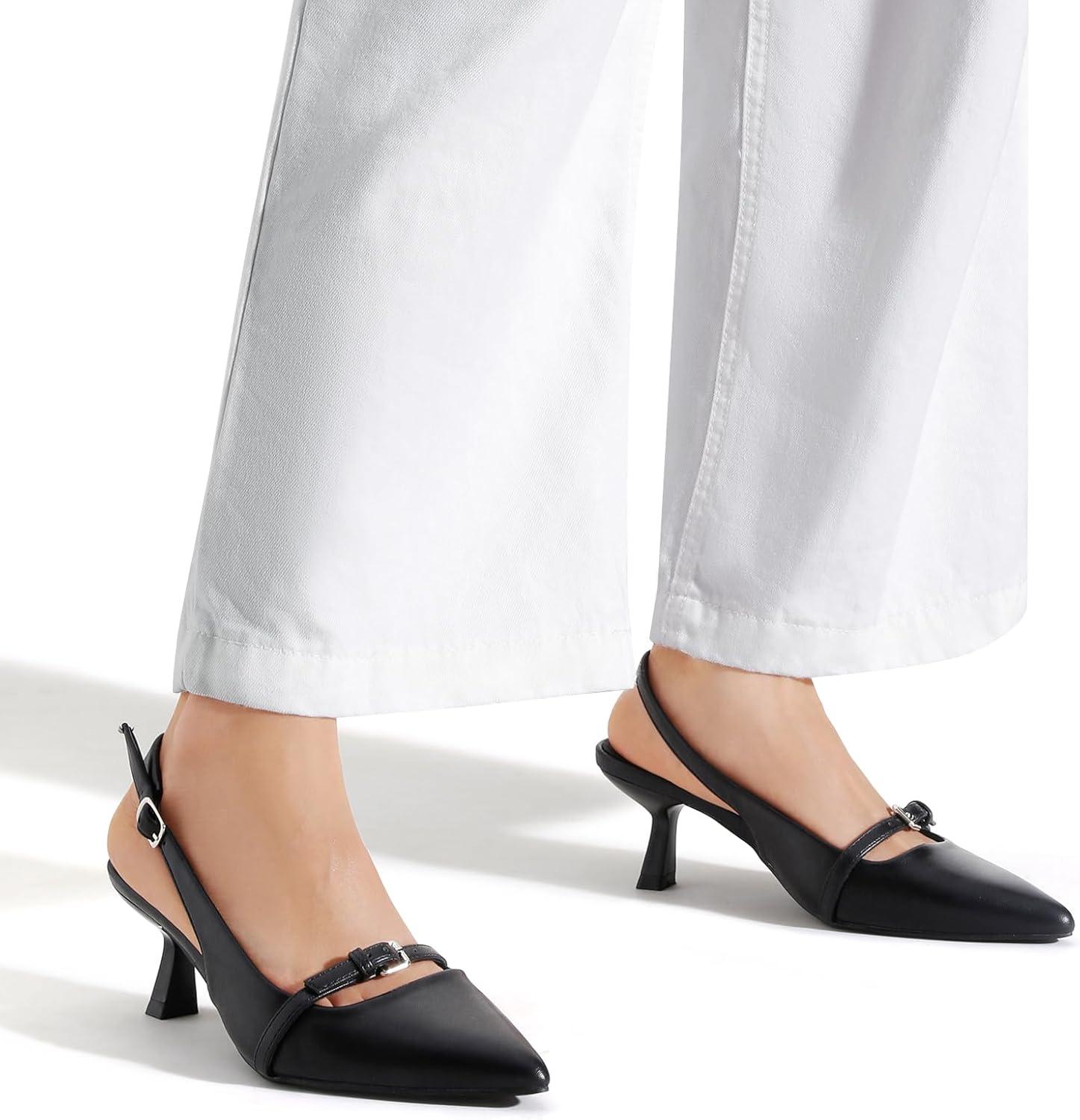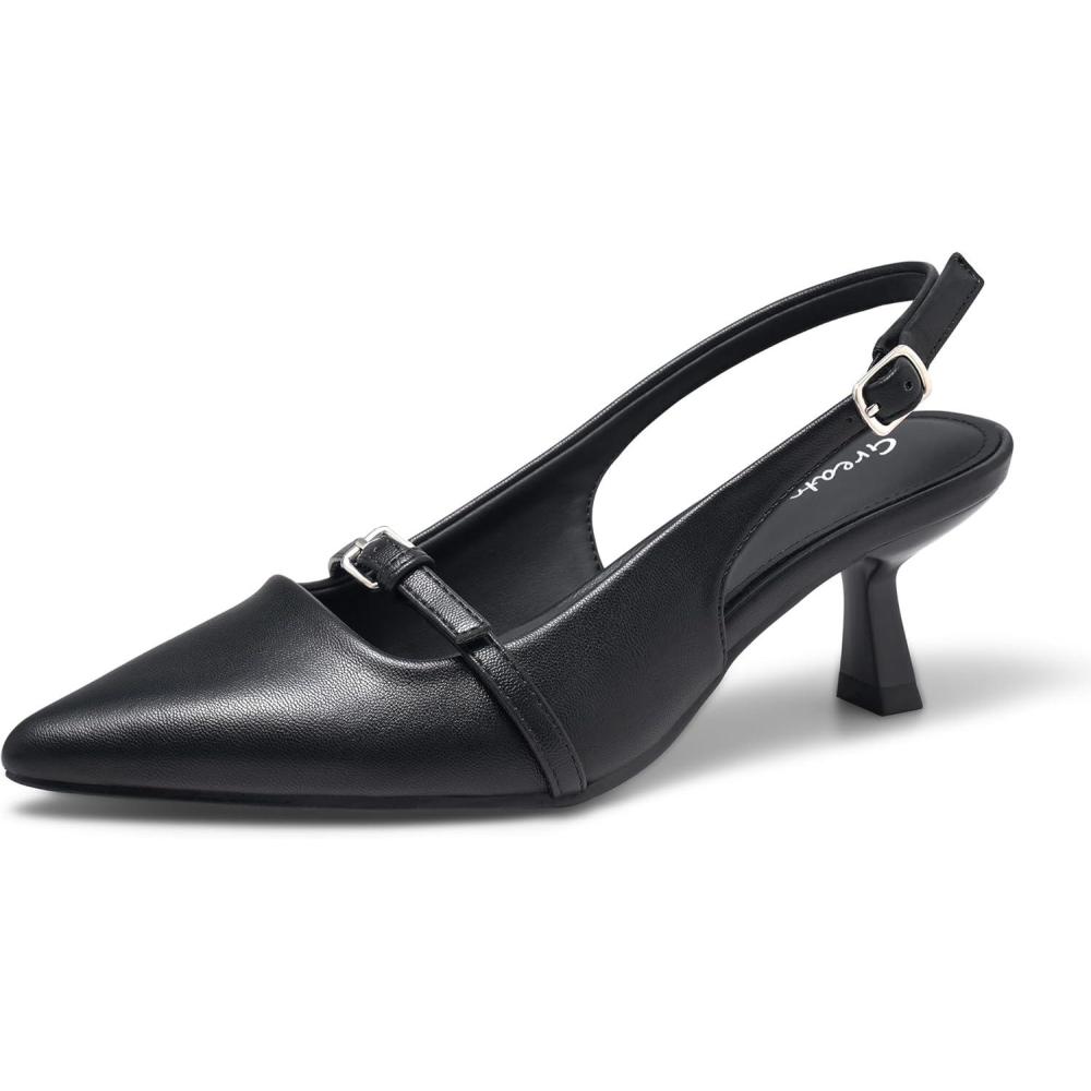Greatonu Women’s Kitten Heels Pointed Toe Slingback Leather Insole Dress Pumps Shoes(Black-mary Jane)