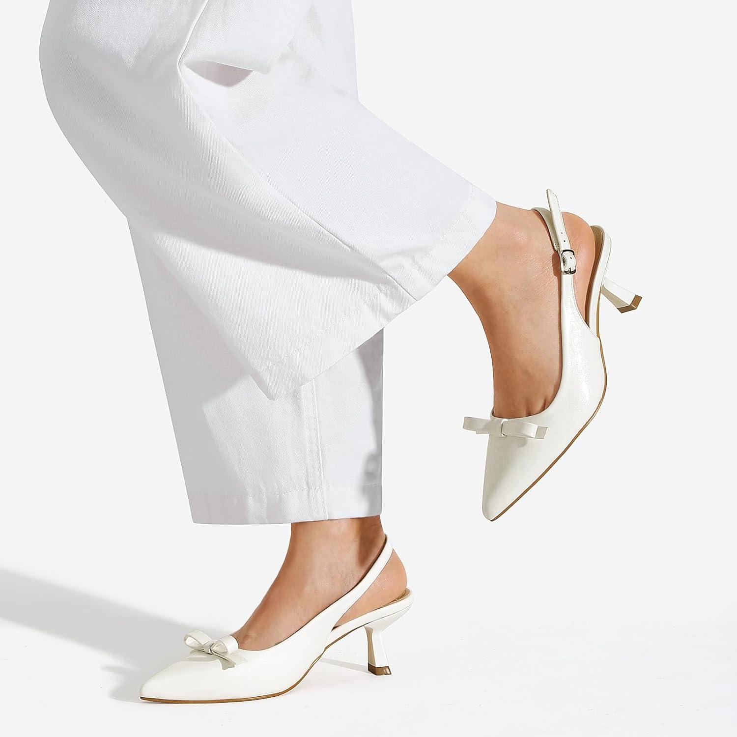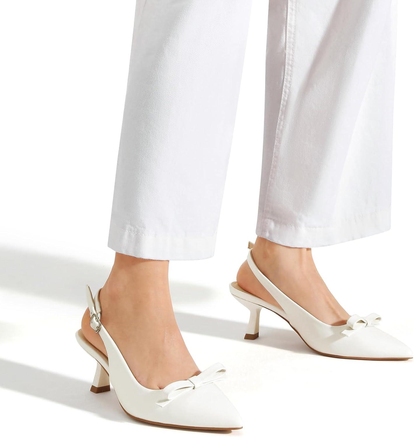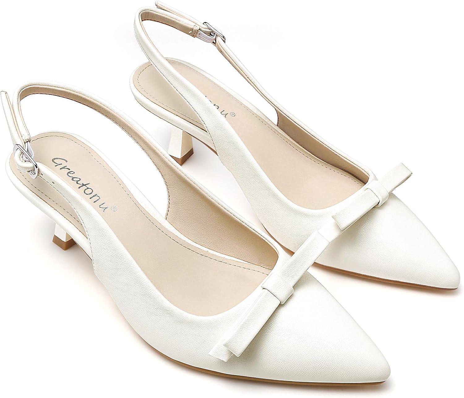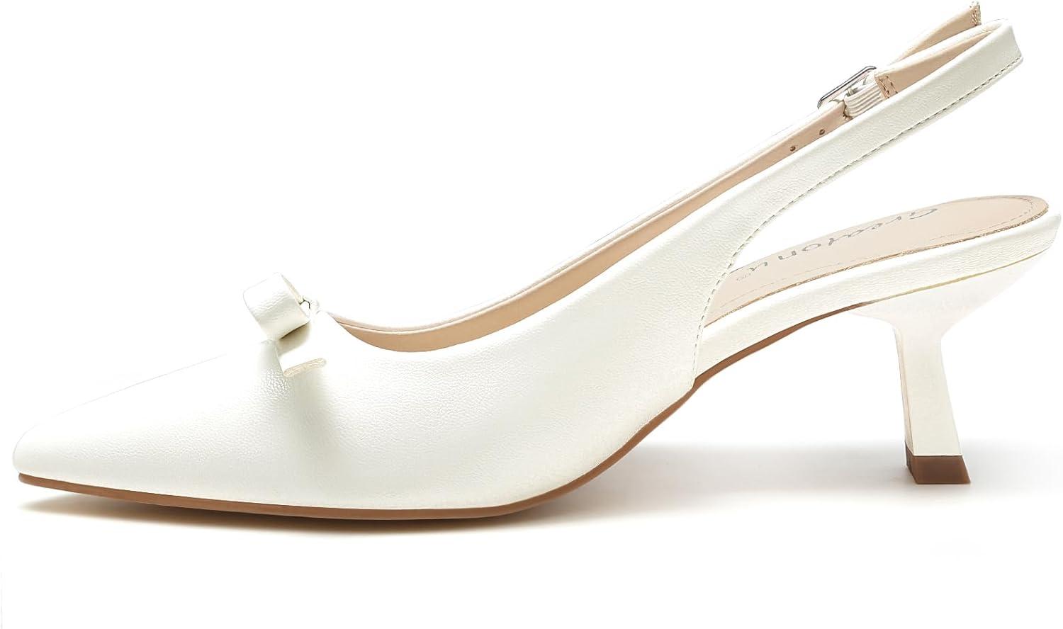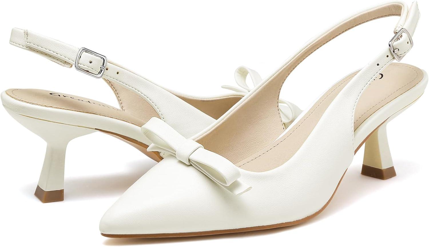 Greatonu Women’s Kitten Heels Pointed Toe Slingback Leather Insole Dress Pumps Shoes(White-bow Tie)